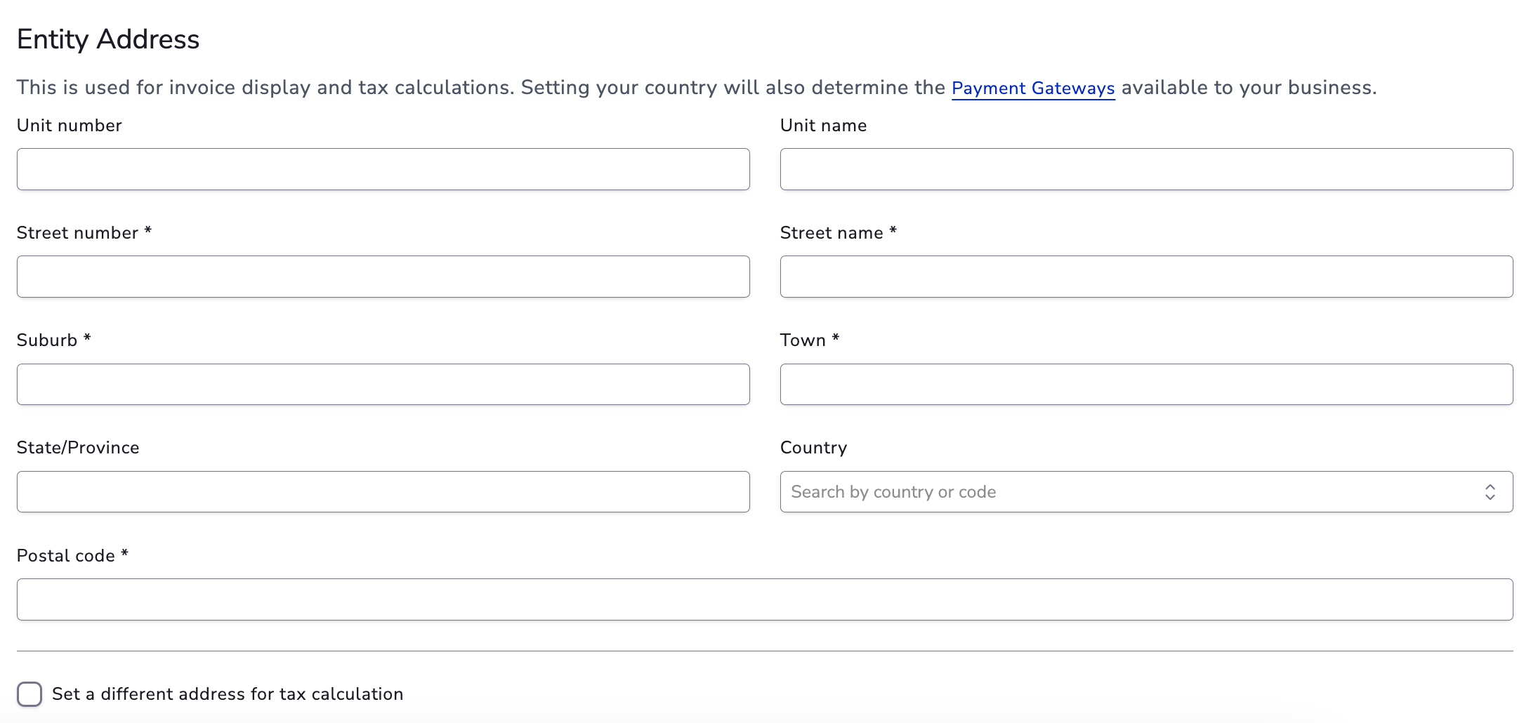 Enter your business address. This address is used for invoice display and tax calculations. The country you select will also determine which payment gateways are available to your business.