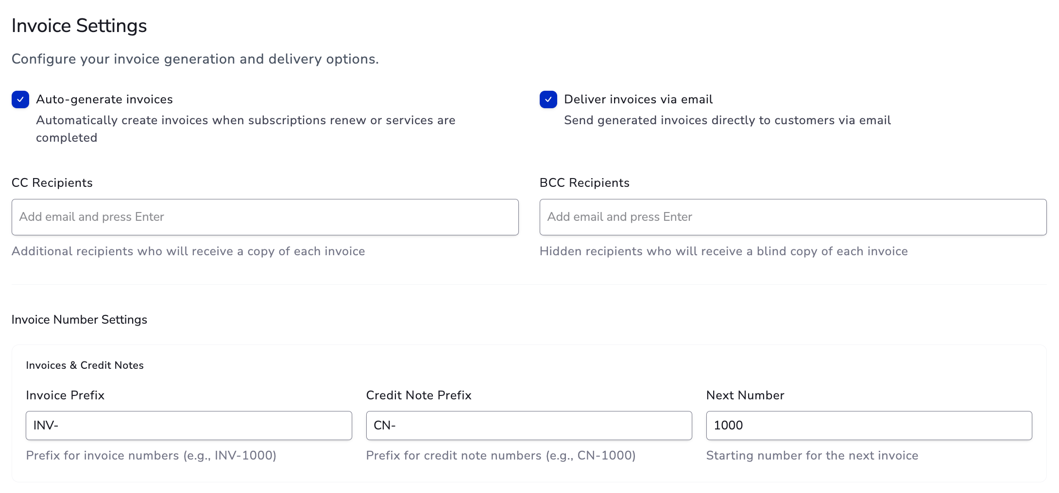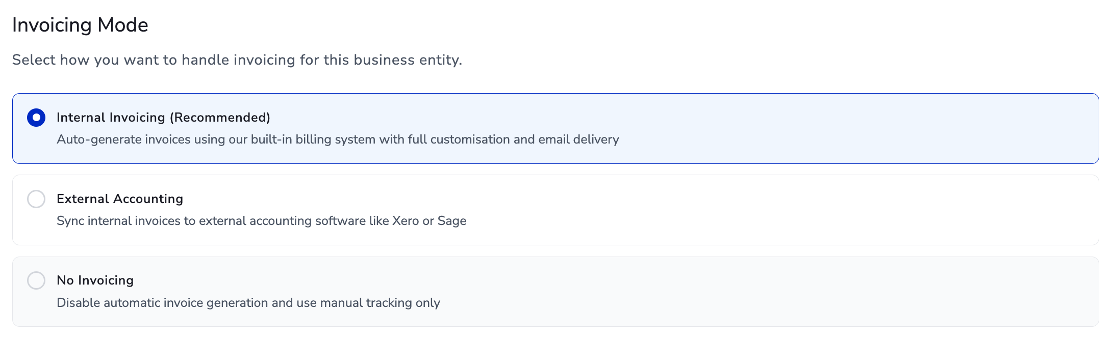 If you select Internal Invoicing or External Accounting, an additional Invoice Settings section will appear where you can configure automatic invoice generation, email delivery, CC/BCC recipients, and invoice number prefixes.