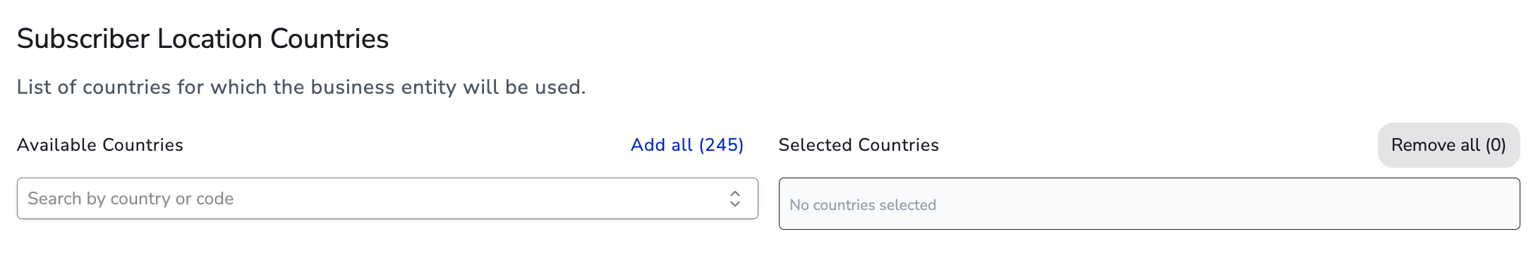 Select the countries for which this business entity will be used. You can search for countries by name or code, add them individually, or click Add all to select every available country.