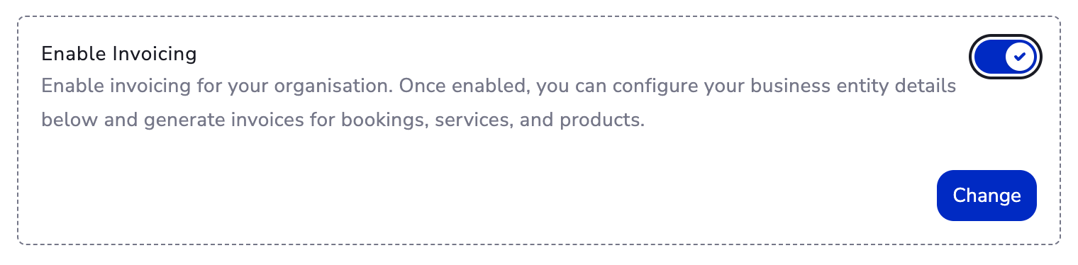 Once changed, invoicing will be enabled and you can start creating or updating your business entity.