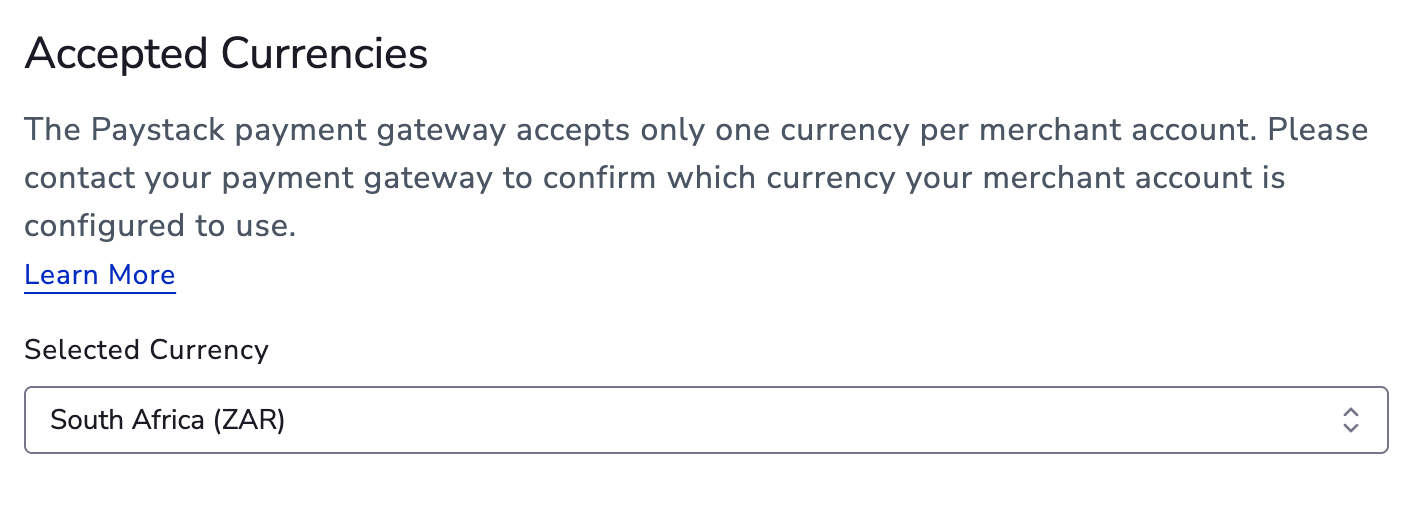 - Set the accepted currencies that your gateway supports for processing transactions.