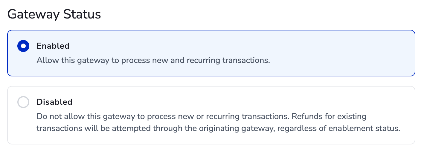 A payment gateway can be enabled or disabled at any time. Enter the gateway configure page and toggle the Gateway Status between Enabled or Disabled. By default, a gateway is set to Enabled when first added.