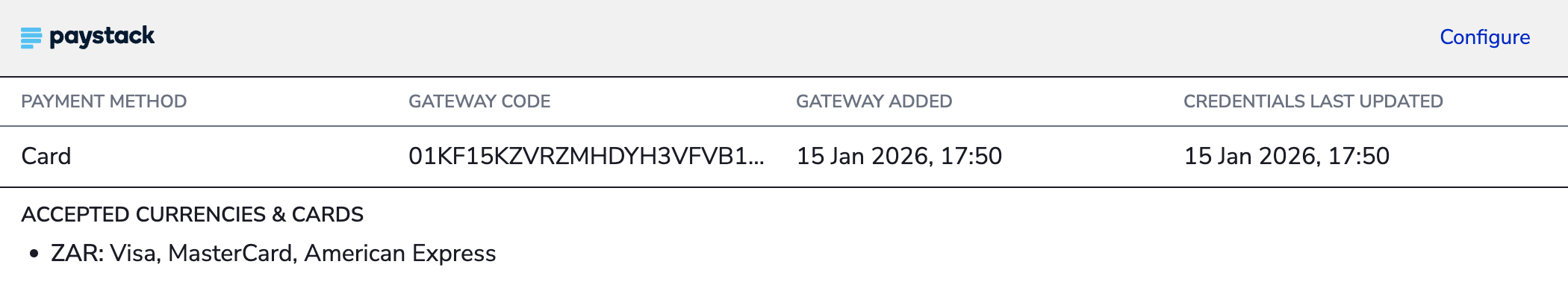 Once you've added a payment gateway, you can return to its configuration page at any time to update credentials, change accepted card types and currencies, or adjust other settings. All options below were set during the initial setup and can be modified as your requirements change.