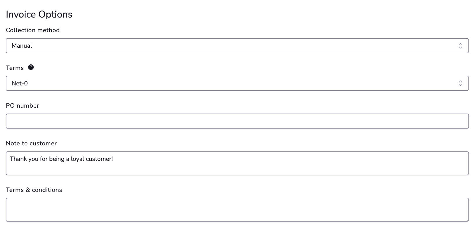 - Terms — How many days the customer has to pay after an invoice is issued. Choose from standard options (Net-0, Net-10, Net-30, Net-60) or end-of-month terms, or set a custom number of days.