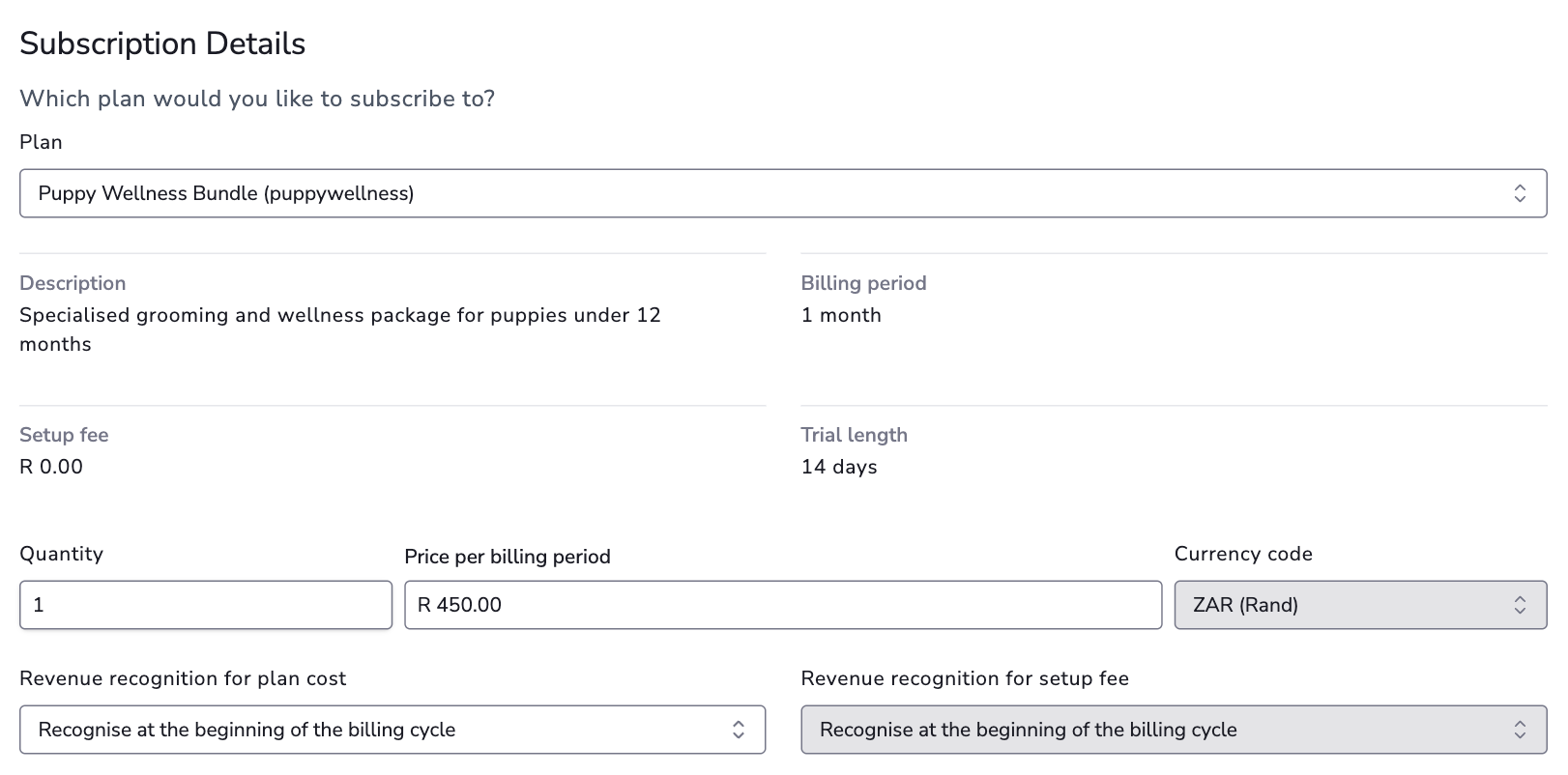 - Revenue recognition — How revenue from the plan cost is recognised: evenly across the billing cycle, at the start, at the end, or never.