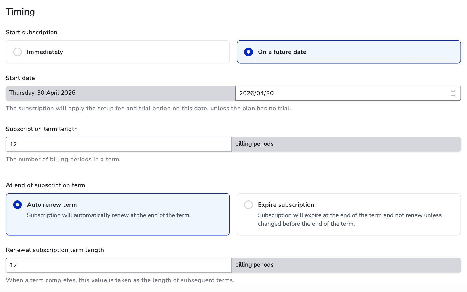 - Start subscription — Choose to begin immediately or set a future date. Future-dated subscriptions enter the Future state and do not generate invoices until the start date.