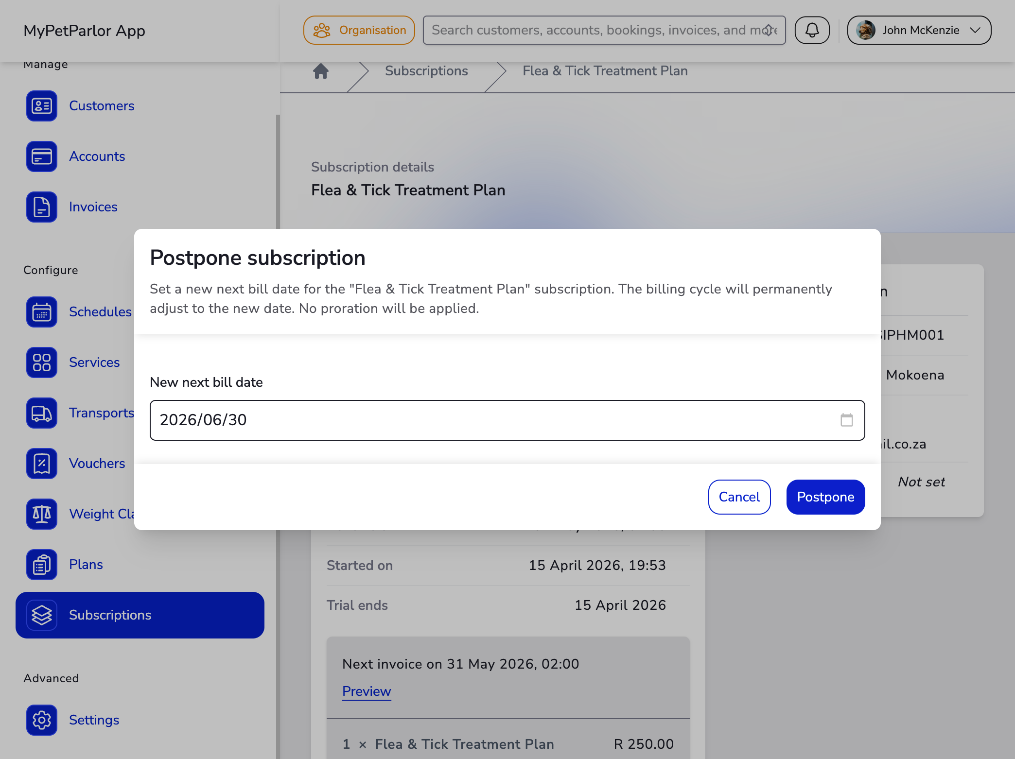 - In the postpone dialog, enter the date you'd like the current period to end and the new billing cycle to begin.