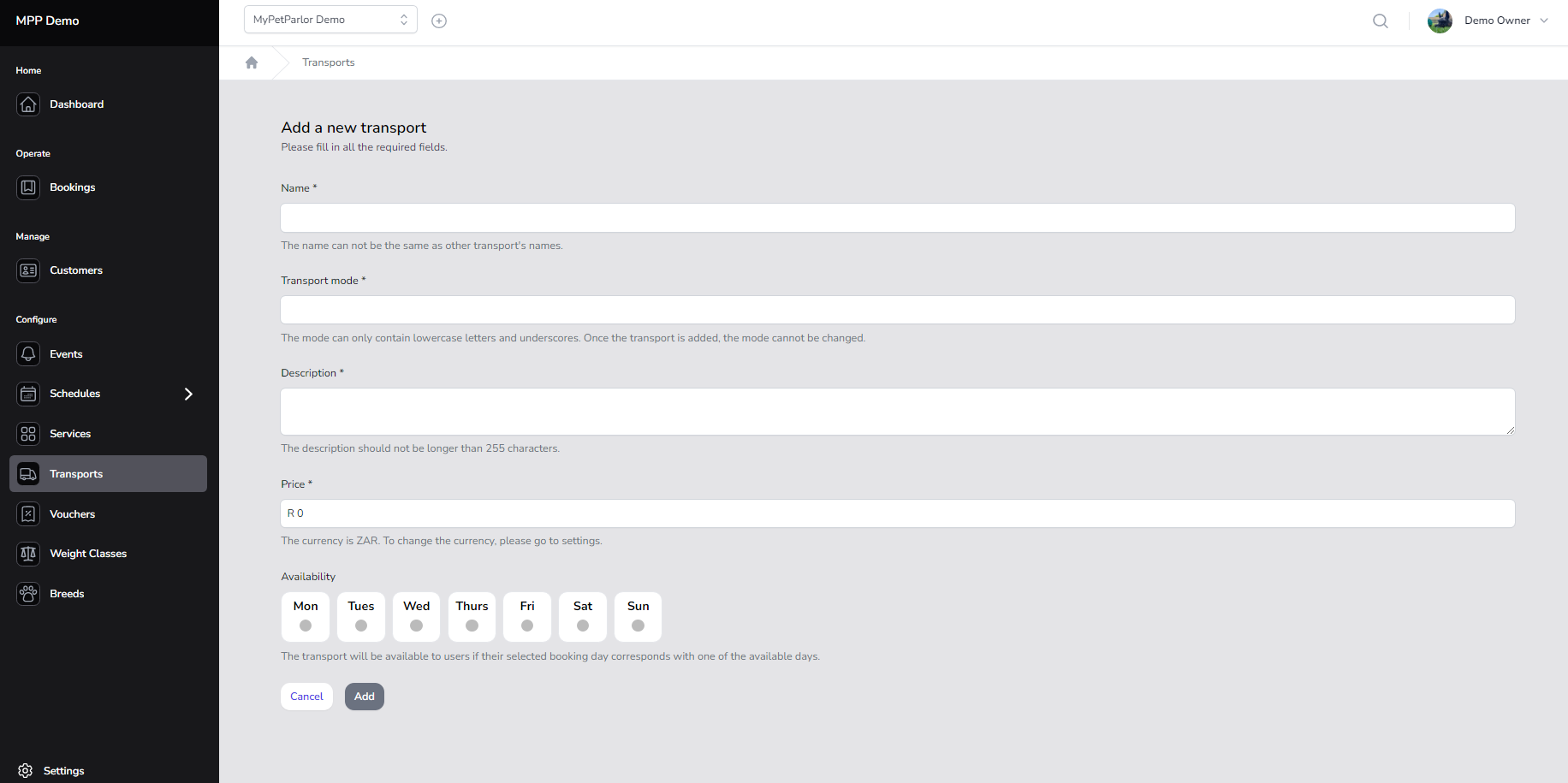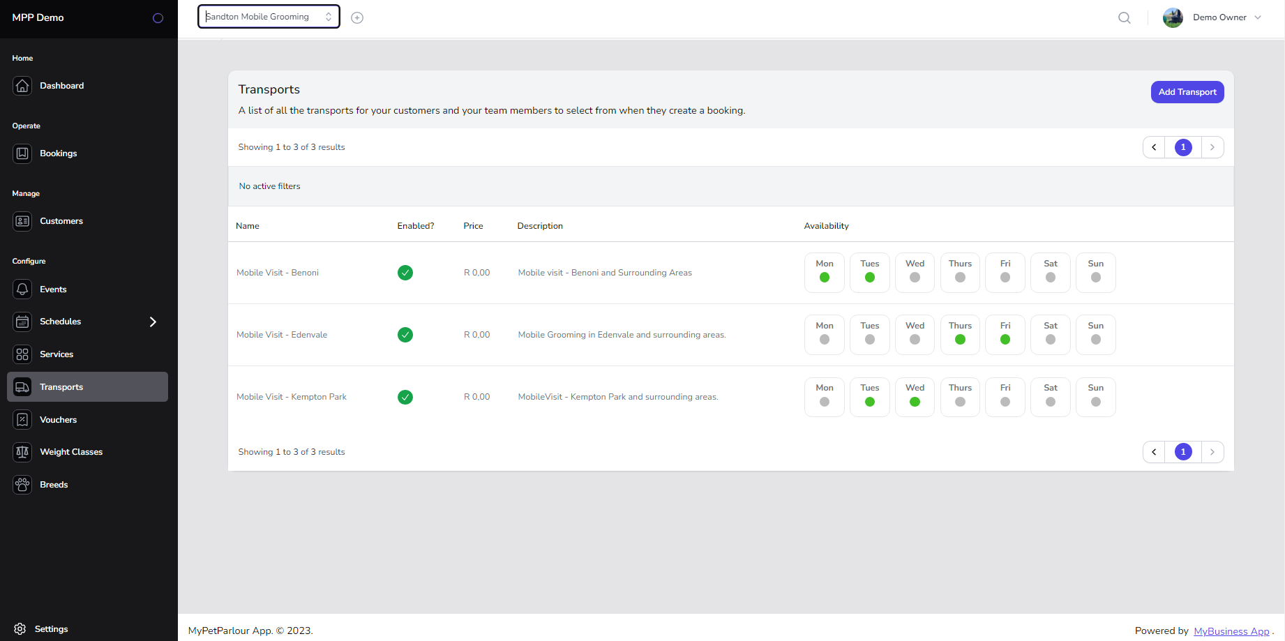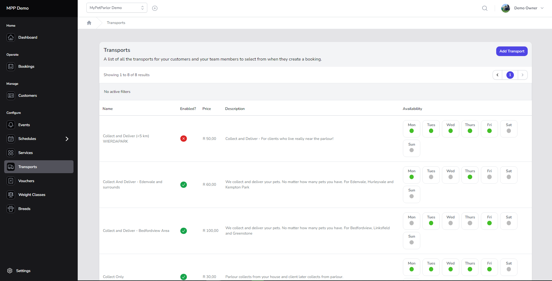 The Transport section allows the parlor owner full control of the pet taxi(s) that are in operation at the parlor, or alternitavely for a mobile parlor team you can specify certain areas for certain dates. The transport is uniquely configurable for all parlor and mobile transport types.