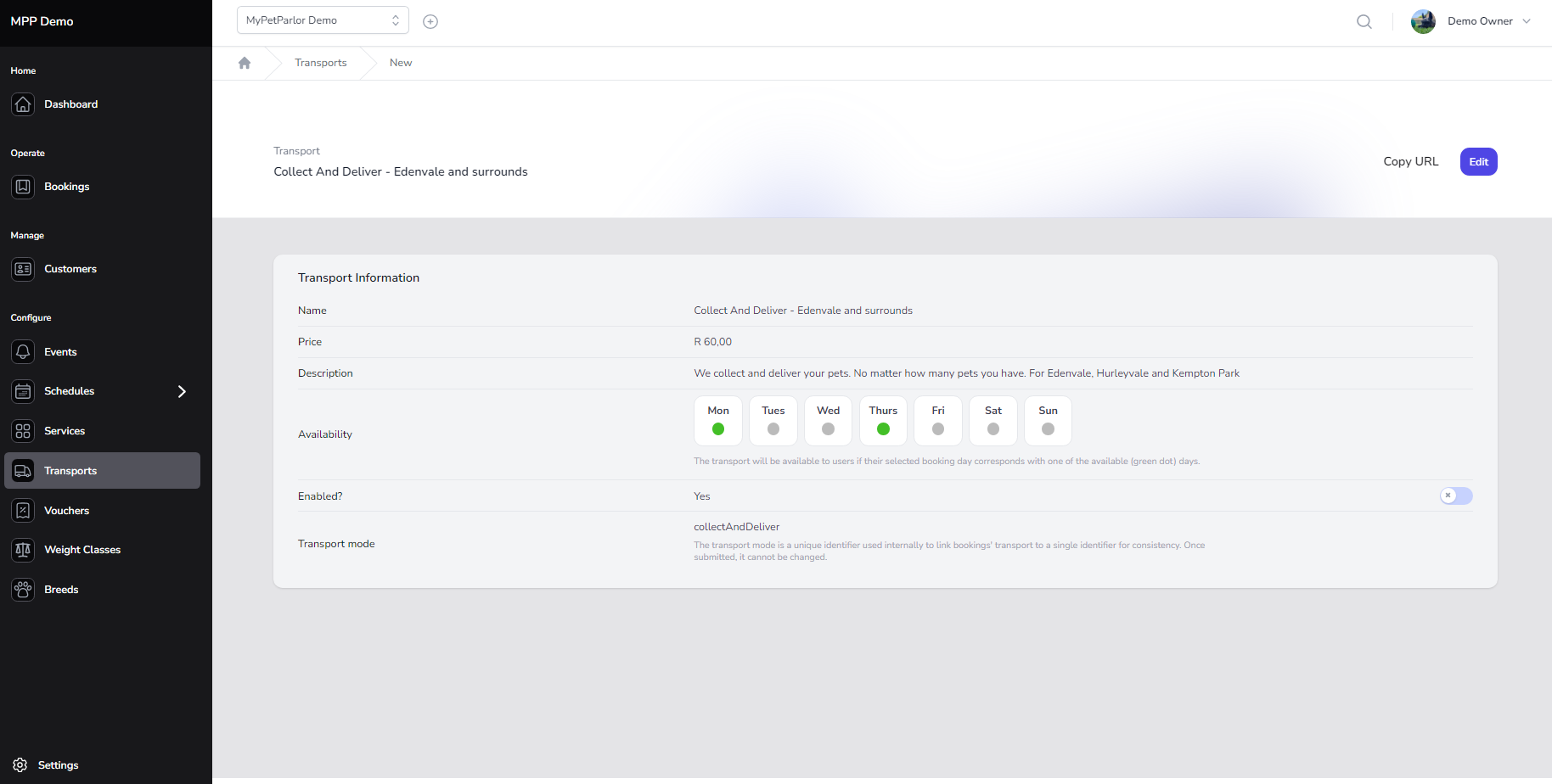 This page allows the parlor owner to view the details of the service and to set the service to be enabled or disabled. By setting the service to enabled, the MPP system will make it available as a transport option on your client app when going through the booking process.