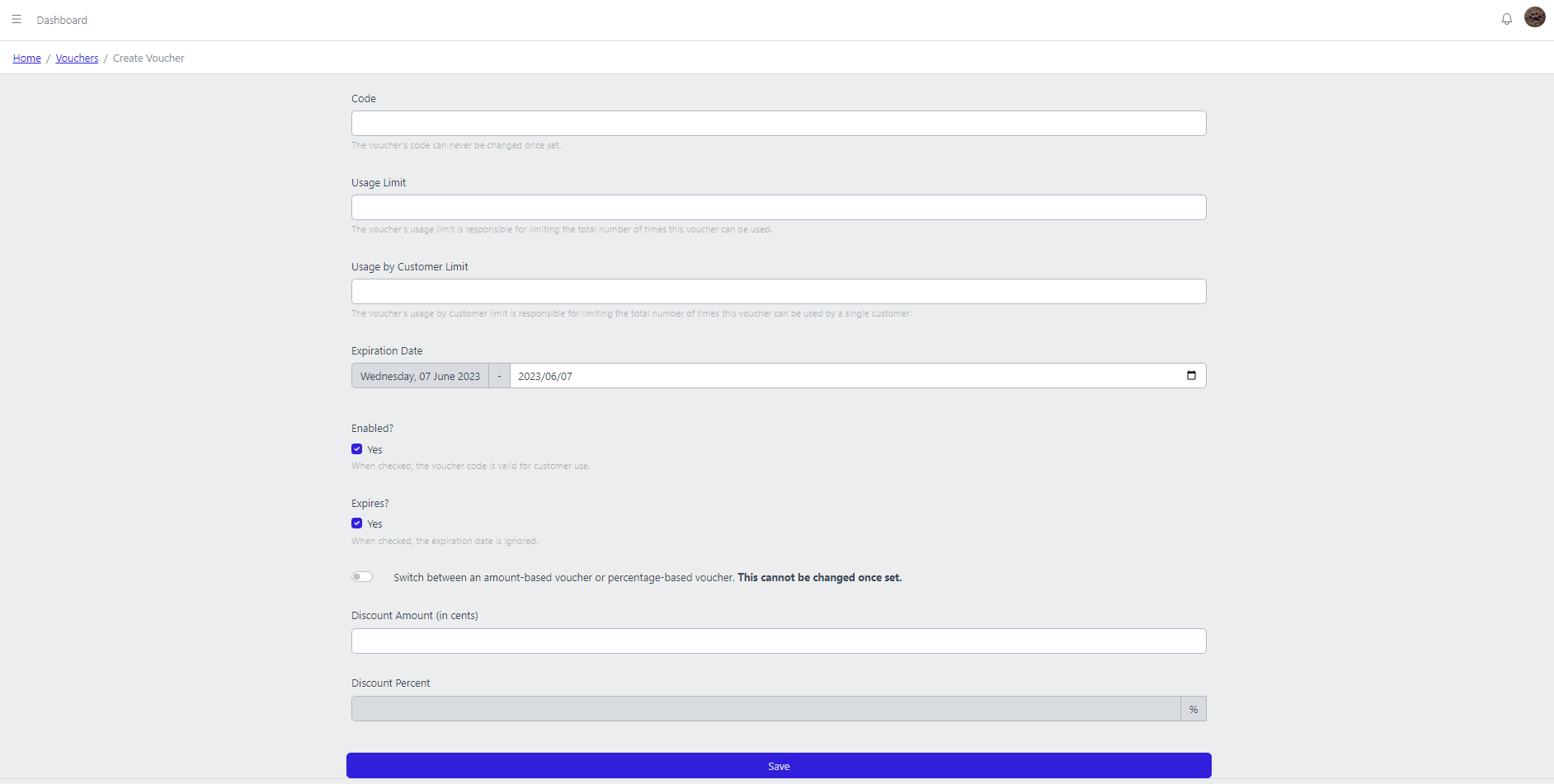 Clicking the create button will allow you to make a new discount voucher where the following configuration options can be chosen