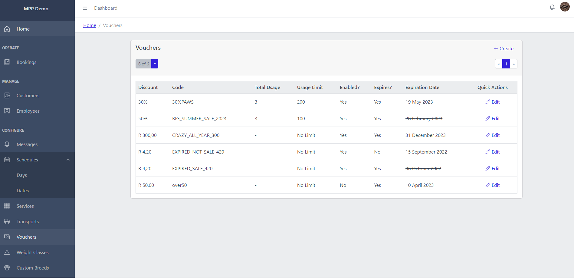 The discount voucher system allows the pet parlor owner to customise the way in which discount vouchers are configured and work. The Voucher configuration screen can be reached by clicking on the Vouchers option from the main menu on the left. This configuration can only be accessed by a user with administrator privileges.