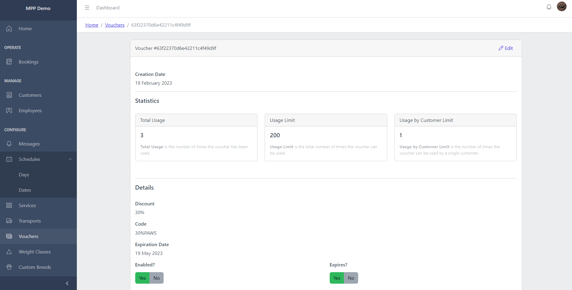 Percentage Discount Voucher - For when you want to give a percentage based discount to client(s) based on the total booking value. This is great for Spring Grooming specials or any other special discounts the parlor owner wants to apply.